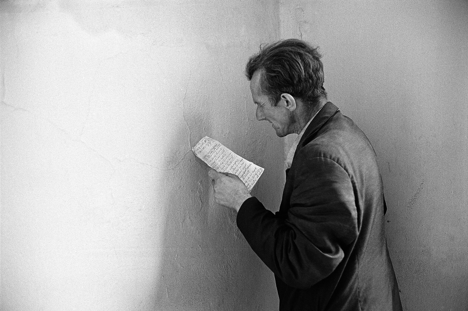 Polen, Częstochowa, 1992, klooster van de zwarte madonna. Terwijl er duizenden bedevaarders op hun knieën rond het schrijn van de zwarte madonna kruipen, staat deze man alleen in een hoekje aan de buitenkant van het klooster. Een papiertje geschuurd uit een schoolschriftje, groots geschreven. De man prevelt woorden die ik niet versta en heeft moeite om te lezen. Ik druk op de ontspanknop van mijn Leica M6, een heel zacht tikje en een veertje dat zich terug opspant. De man kijkt niet op en praat verder, het is zijn brief aan de allerhoogste.