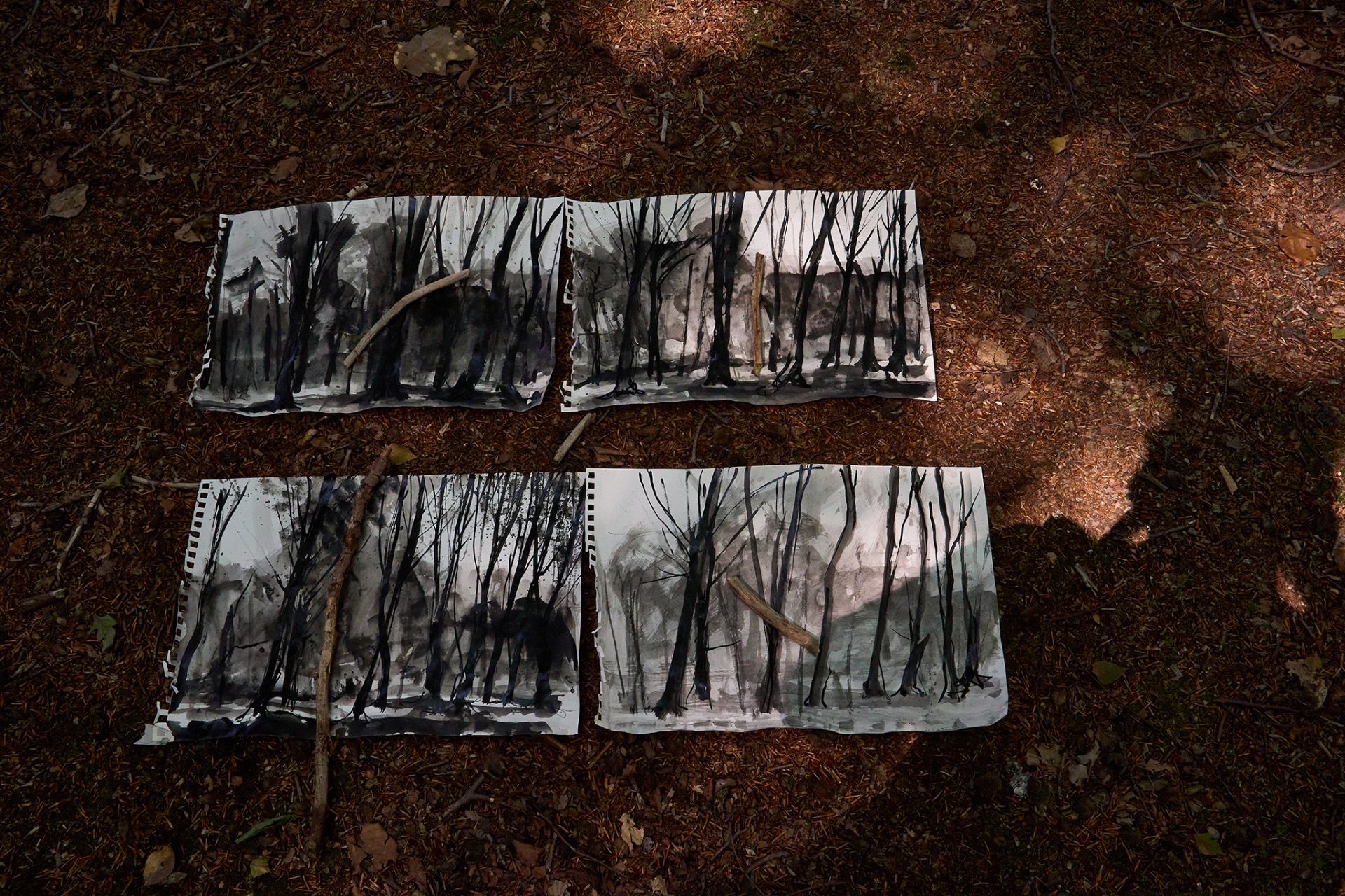 De periode van snelschetsen naar model bracht me bij deze natte techniek. Hiermee kan ik al mijn energie en expressie tot leven brengen. Het is altijd vooruit, gommen of uitwissen bestaat niet. Bedenken van andere oplossingen moeten snel gebeuren. Wat en hoe wil ik het vertellen? Dikwijls is een nieuw blad de beste oplossing, de golven in het dunne papier geven de massa van de inkt aan, eens gedroogd is het onuitwisbaar. Die zelfde energie die ik krijg van de natuur probeer ik over te brengen naar mijn atelier op groter formaat. Deze buitenbelevingen starten vanaf 2024.